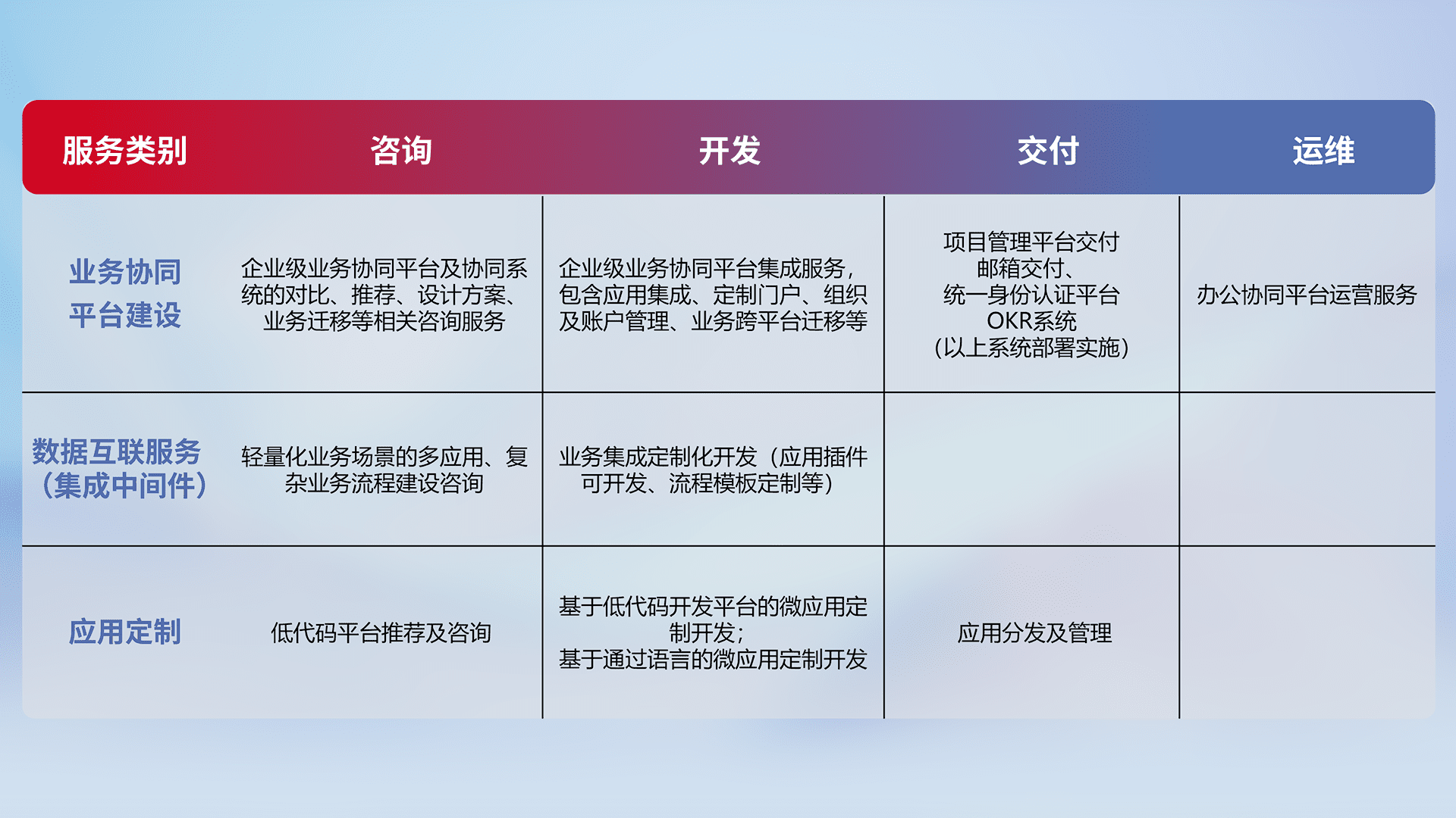 针对钉钉、、、企微、、、、IDaas等平台级产品提供产品的规划、、、、方案、、交付、、、定制化开发等服务,,,,实现如统一协同办公、、智能客户服务、、、、混合会议管理、、、、智能数据查询、、、等业务场景,,,,实现数字化转型。。。